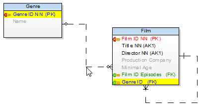 The Film ID as the unique identifier for Film is sufficient. Therefore the non-identifying relationship is used. The Genre ID is only a foreign key. The film can exist without being assigned to a genre, therefore the Film entity is an Independent entity.