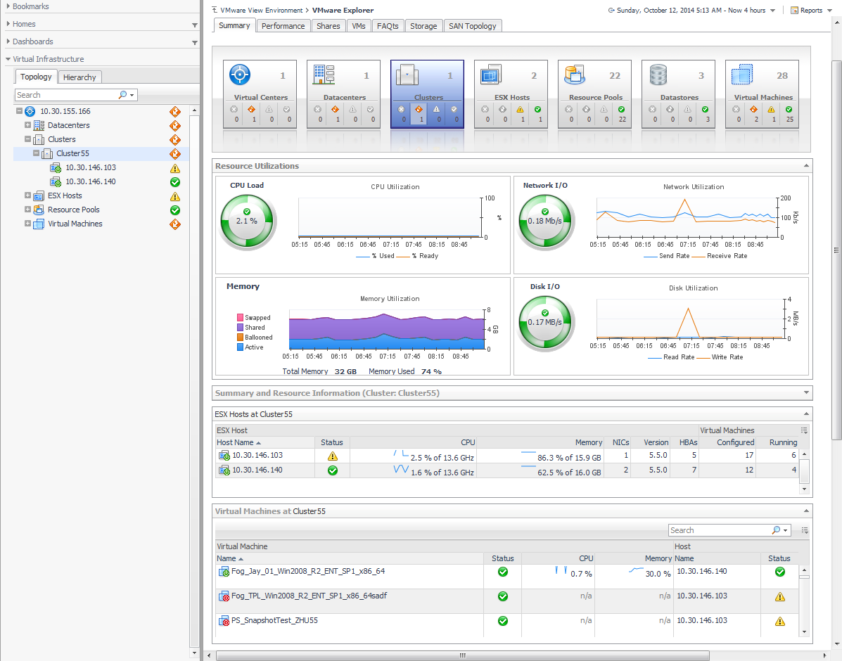 The VMware Explorer allows you to monitor a wide range of elements in your virtual infrastructure. It contains a number of informative views through which you can quickly and easily access detailed information about any of the available components (physical or virtual) within the infrastructure. Its hierarchical interface includes drilldown capabilities that display various performance metrics and alarms within the virtual infrastructure.