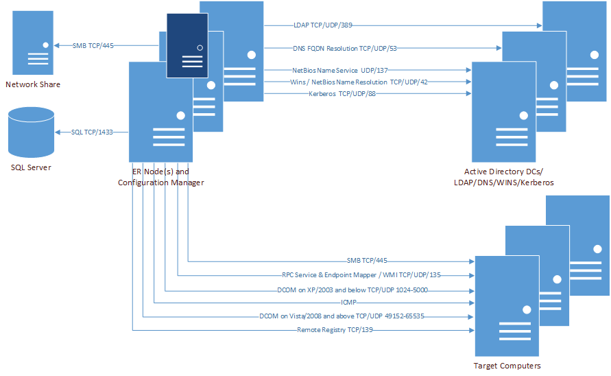 The following figures outline the ports used by the Enterprise Reporter discoveries.