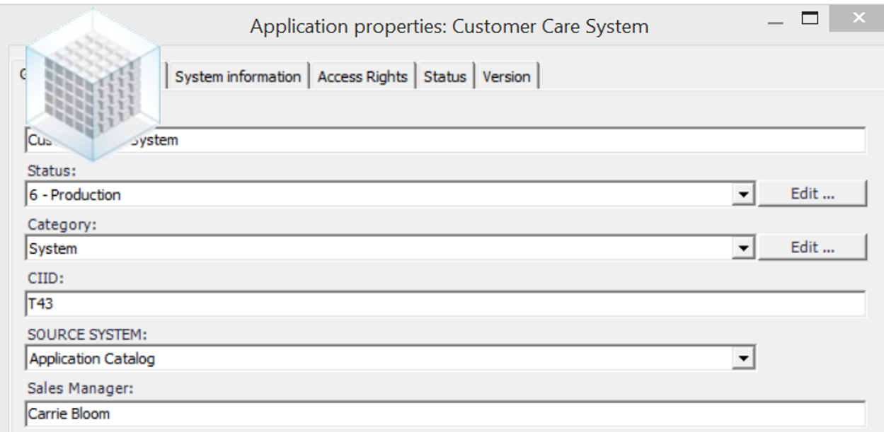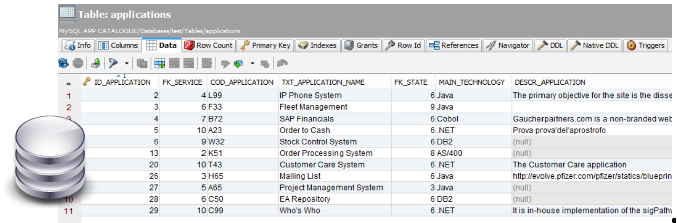 a Service Catalogue manages enterprise services data, stored in a MS SQL database table. The service table identifies the item with a “COD_APPLICATION” field, which is differentiated by the Erwin ID of the model for the same item: