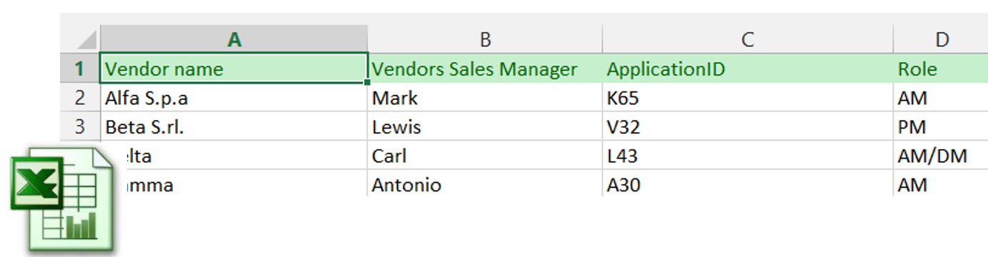 Vendor data for any application are provided by another APM tool, via an Excel report. The file relates the Vendor and the Sales Contact with an Application through its CMDB code: