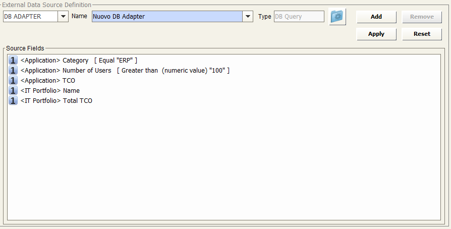 Select the name of the DB Adapter from the drop-down list, Name (only DB Query and Stored Procedure Adapters will appear in the list)
