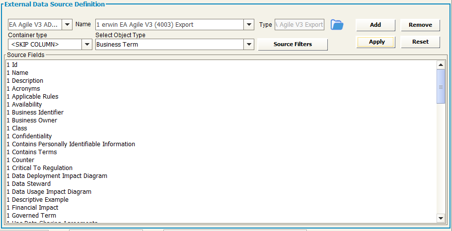 extract through an EA Agile Adapter for the selected object type. The “Source Filters” button allow user to pick only the desired information, while default operation includes all of them.