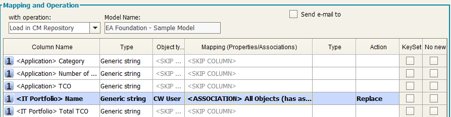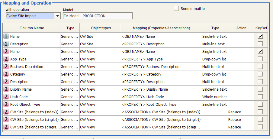 No New: when importing data from an external source, it’s possible that the master list of objects involved in the operation is the one contained in EA Agile V3 workspace. In such a case, the user would want existing object to be updated (for the only properties used in mapping), but no objects to be created. If so, user may choose to check “No New” option, on the keyset of the master object type, and this will prevent new objects to be created, while existing will be updated within bounds of mapped properties. The same applies when the object list which has not to be extended is the one related to an object type associated with the master, involved in the operation. In such a case, user may choose to check “No New” option, on the record related to the association, and this will prevent new associated objects to be created.