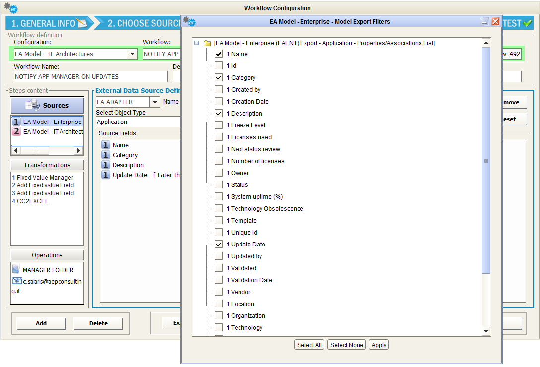 2.Choosing applicable data sources, and providing normalization parameters (like name of the sheet for Excel files, or the object type to extract for an EA/EA Agile Adapter)