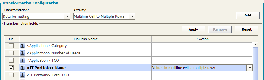 To define the transformations in the intermediate step of the new Workflow follow the following steps in the section Transformation Configuration: