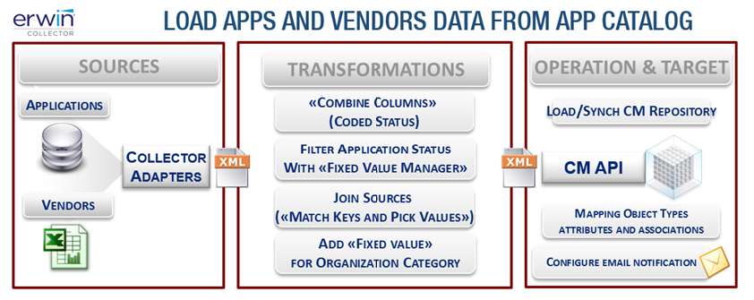 This example describes the following use case: application and vendor data stored in different external tools must be loaded consistently in a CE repository.