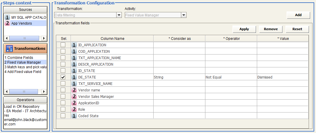 Let us suppose that “Status” field in CM model is coded, combining the status id with the status description (for example “6 - Production”). Combine the application status code and application status description (columns “1 ID_STATE” and “1 DE_STATE”) in a new column named “1 Coded state” with a given separator according to target model conventions: