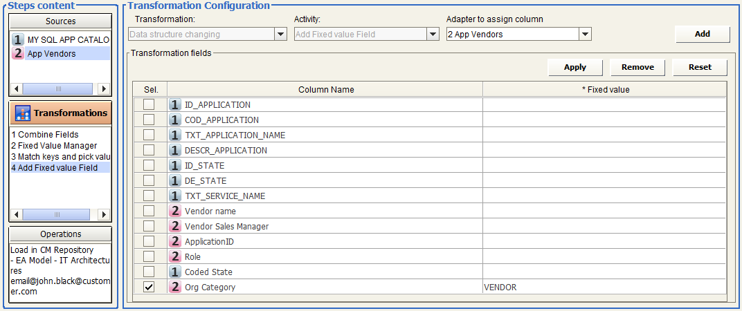 Choose “DATA STRUCTURE CHANGING” and “Add fixed value Field”, with name “Vendor Category” and value “VENDOR” and assign to Adapter “2 App Vendors”: