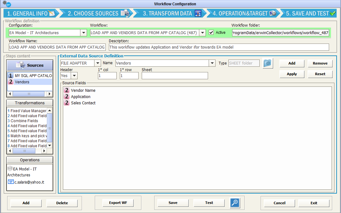 Vendor data for any application are provided by another APM tool, via an Excel report. The file relates the Vendor and the Sales Contact with an Application through its CMDB code: