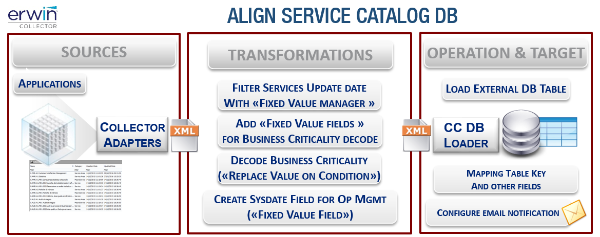 a Service Catalogue manages enterprise services data, stored in a MS SQL database table. The service table identifies the item with a “COD_APPLICATION” field, which is differentiated by the Erwin ID of the model for the same item: