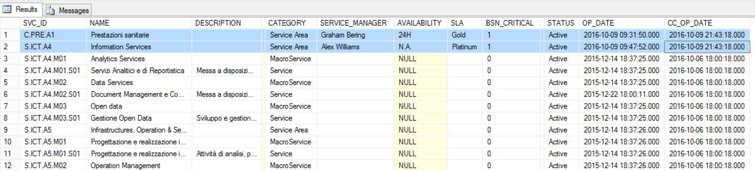 To optimize the data flow, filter source data in order to export only the more recently updated. Use then a “Data filtering”, “Fixed Value Manager” to manage only services with “Status” equal “6 – Production”.