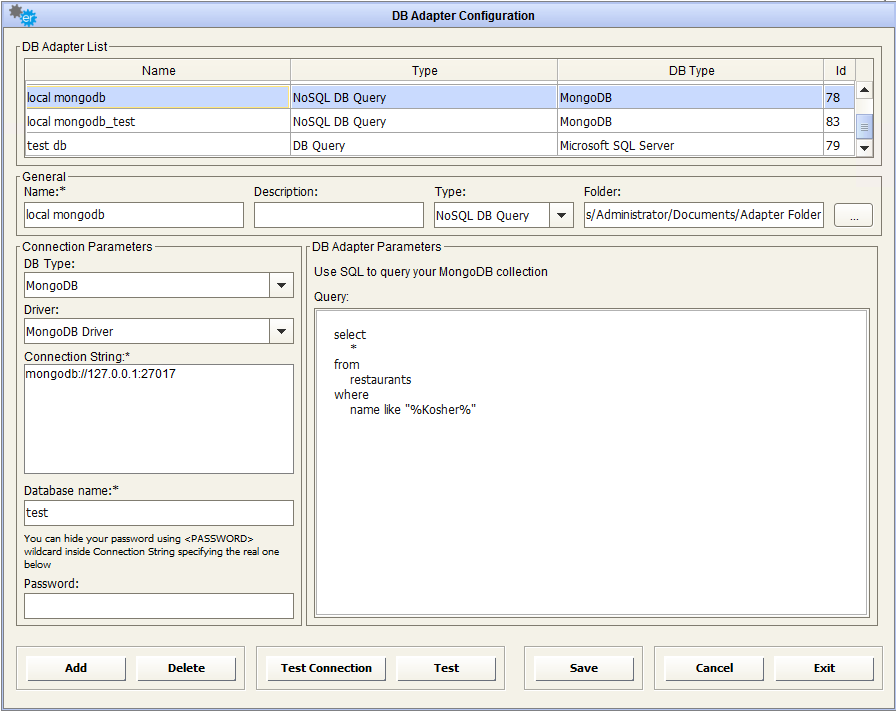 In the Connection Parameters, user is asked for: Connection String, Database name and Password. For local connection, Connection string is usually mongodb://127.0.0.1:27017, while for cloud connections, Connection String can be automatically retrieved from the Connect button inside MongoDB web console. Connection String samples are:
