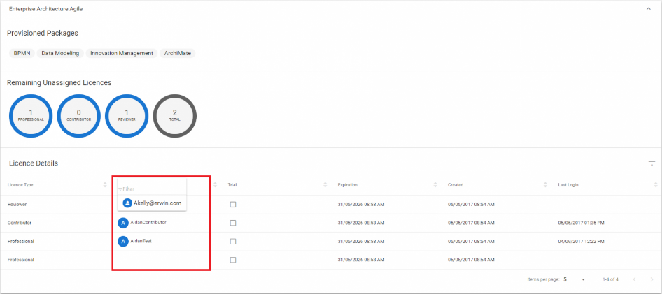 Client Administrators will be created by erwin and assigned the purchased license types within the tool by erwin. Client Administrators can then assign license for other users within their organization.