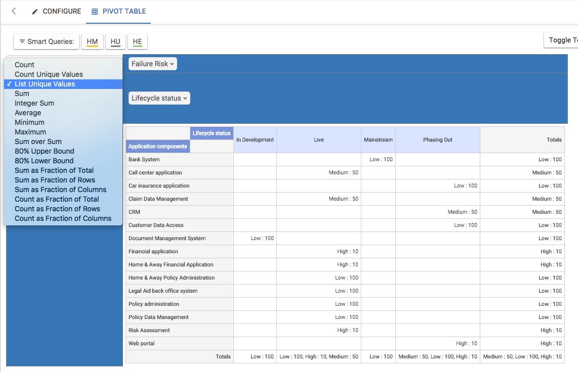 The pivot table provides the ability to slice and dice your objects by their attributes.
