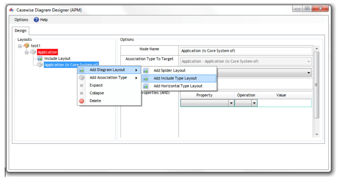 To add a Design Layout, you need to right click on an object node without any Design Layout. On the context menu you will have the option “Add Diagram Layout”, and then choose the diagram Layout you want to use depending on your requirements.