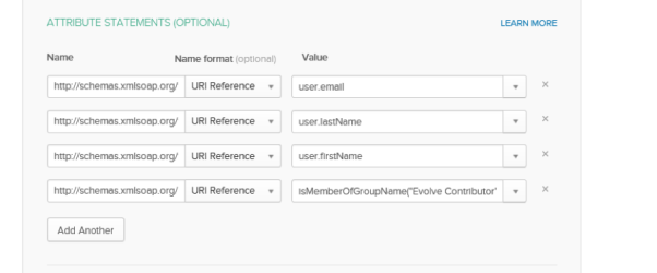 IMPORTANT NOTE: in the above value we have specified the name of the Okta Groups in this case the group names are “Evolve Contributor” and “Evolve Social”. These are the Group names you must specify in Evolve Designer. This States that any user that in in the Okta group “Evolve Contributor” will be passed as a Contributor user and any user in the Okta group “Evolve Social” will be passed as a Social user. Finally any user that is not a member of either Okta groups will be passed as “No” and will gain no access. |