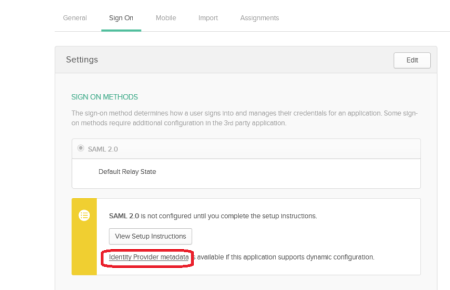 In the Okta Admin Page under “Sign On” you will find the “Identity Provider metadata” link to download you’re the metadata.