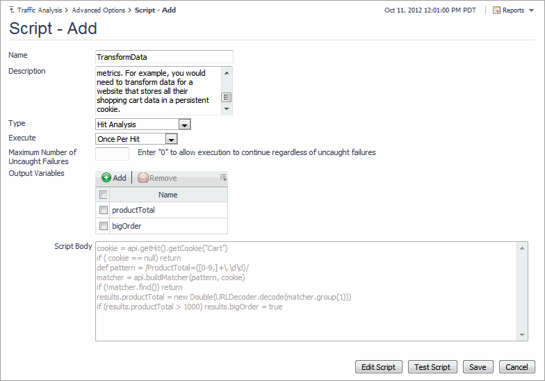 Display Only—to add or edit a script, click Edit Script. For more information, see Creating scripts.