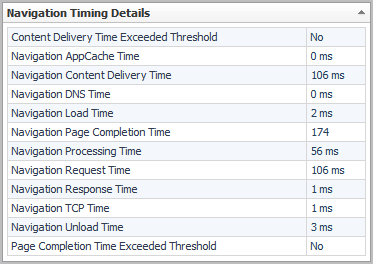 Navigation Page Completion Time—the total time taken from the beginning of a navigation action (such as a click on a hyperlink) to the end of the load event when the page has been completely displayed in the browser. For an example, see “Tracking time spent on a page using instrumentation” in the Foglight APM Reference Guide. |