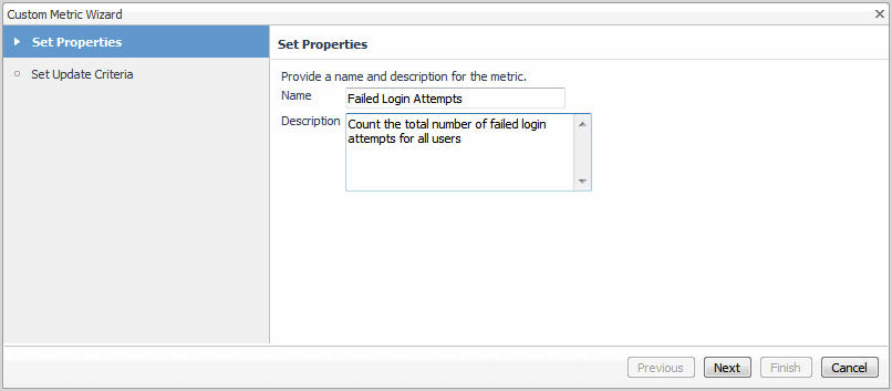 The Metric Wizard opens. Use the Previous and Next buttons to navigate between screens.