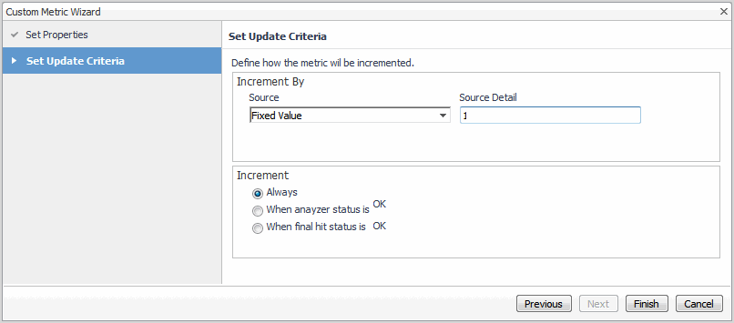 Increment: By default, a custom metric is always incremented. You can change the update policy based on the analyzer status or the final hit status (which is the worst status of all the analyzers that match a hit). For more information, see Updating custom metric values.