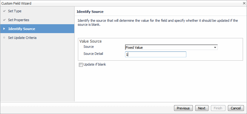 Source: Select the source of the value used to update this custom field—such as Fixed Value, Script Output, Session Custom Field, or one of the hit details. The other available fields change depending on the selected Source.