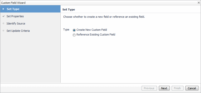 On the Set Type screen, specify whether you want to modify an existing custom field or create a new one.