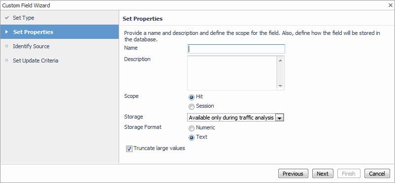 On the Set Properties screen, if you are modifying an existing custom field, select the custom field from the list. If you are creating a new custom field, specify the following options: