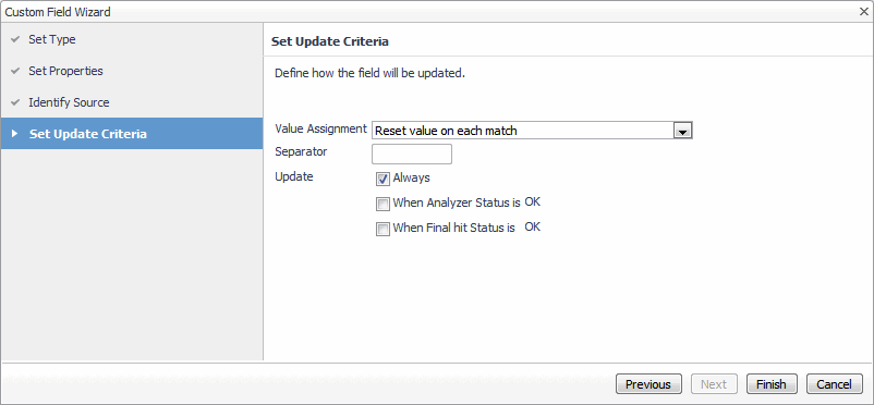Update: By default, a custom field is always updated. You can change the update policy based on the analyzer status or the final hit status (which is the worst status of all the analyzers that match a hit). For more information, see Defining custom field updates.