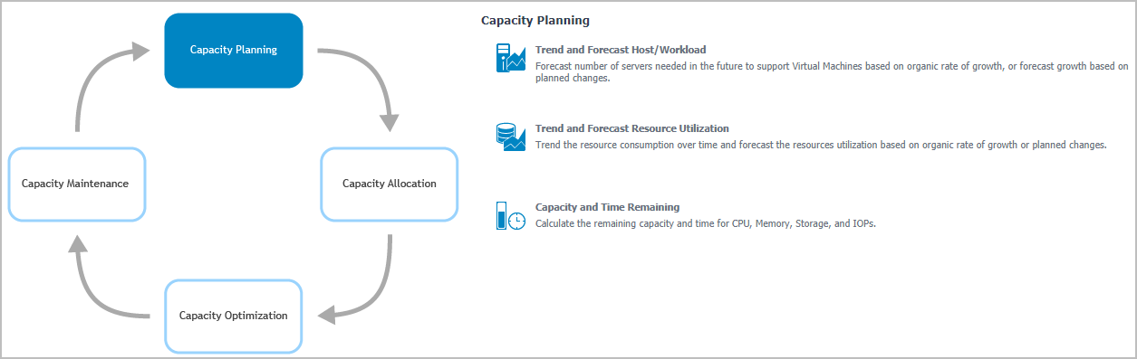 The Capacity Planning view provides a list of tasks that system administrators typically perform when planning the capacity of a virtual environment. Clicking a task directs you to the view where you can perform the selected task:Allows you to forecast number of servers needed in the future to support Virtual Machines based on organic rate of growth, or to forecast growth based on planned changes. Click this link to navigate to the Resource Utilization view > Hosts and Workload tab. Allows you to trend the resource consumption over time and forecast the resources utilization based on organic rate of growth or planned changesClick this link to navigate to the Resource Utilization view > Clusters tabAllows you to calculate the remaining capacity and time for CPU, Memory, Storage, and IOPsClick this link to navigate to the Resource Utilization view > Clusters tab.