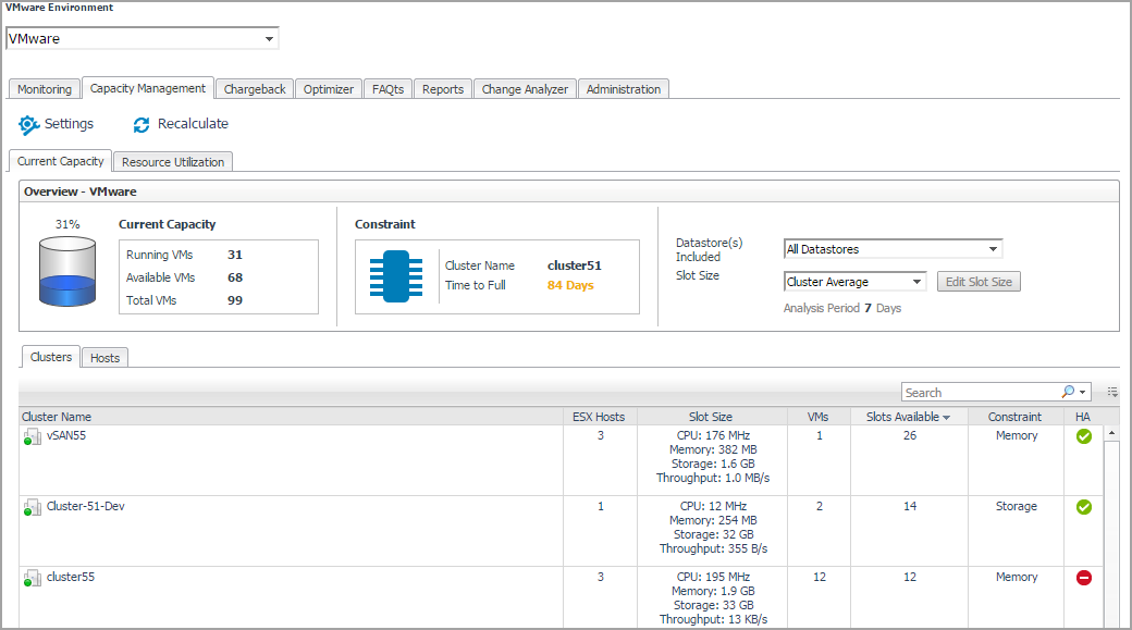 Foglight™ Capacity delivers an essential capacity management for virtual infrastructure. Get deep insight into your environment, including the availability and estimated time left for CPU, memory, storage, and IOPs. Use historical trends to better forecast resource requirements for clusters, hosts, and workloads—and proactively predict and budget for capital expenditures.