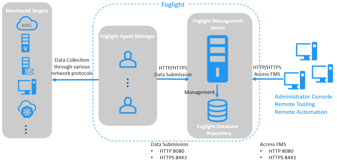 Foglight® consists of the Foglight Management Server (FMS), a database repository, and a set of cartridges. Foglight relies on a browser-based user interface and is controlled via role assignments in the Foglight security model. The Foglight Web application runs in an Apache Tomcat® server. Users interact with the FMS Web application via an HTTP or HTTPS connection.