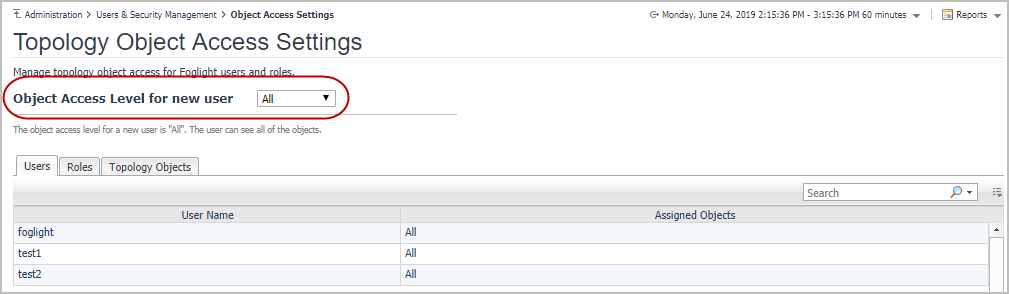 The administrators can assign objects to user or role by using the Users, Roles, or Topology Objects tabs. A user can see clearly which objects are assigned through the Users tab.