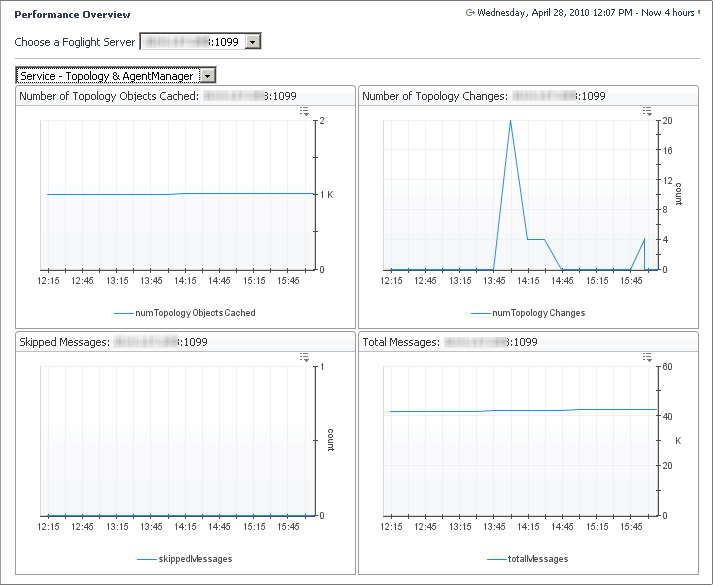 This view shows the number of topology changes, skipped messages, and total messages. This view is useful for understanding the topology structure relating to agent activity.