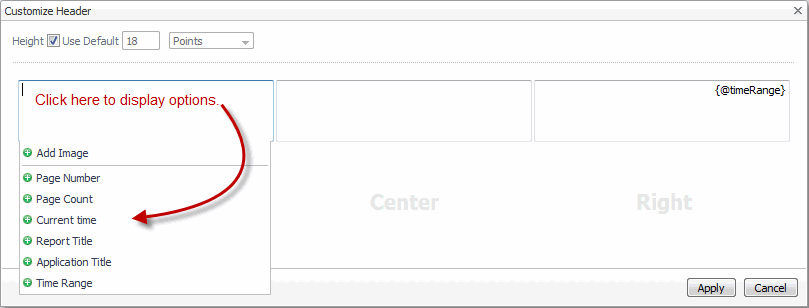 If you want to add images to the report, click the add icon to the left of Add Image to open the Select an Image dialog box. You can add an image either on the right or left side of the header. |
