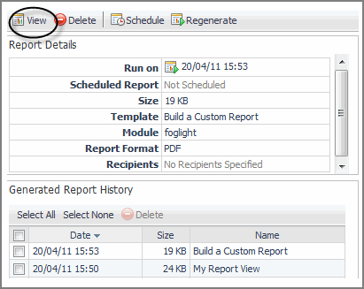 Next you can run or schedule the report. See Running a Report. You can also create a scheduled version of a report that has been generated. For more information, see Managing Reports.