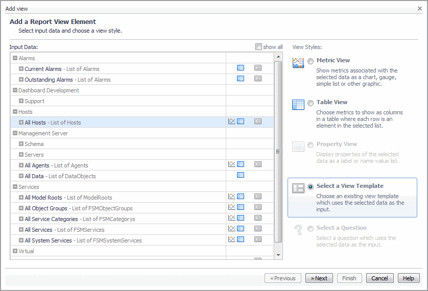 On the Add View wizard’s Select Add a Report View Element step, select the input data you want to use. |