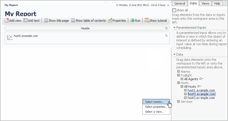 Add views to you custom report template or dashboard by dragging data objects onto the workspace from the list in the Data tab. If the data object you drag and drop supports two or more view types (for example, a host), a list appears from which you can select a create a metric view, a table view, a properties view, or select a view template. See Adding a Metric View, Adding a Table View, Adding a Property View, and Using an Existing Template for details.