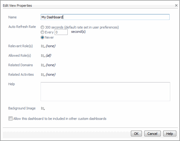 For dashboards: select an Auto Refresh Rate option to refresh the dashboard at regular intervals (or not at all). The default rate is 300 seconds. You can also specify a custom rate (in seconds) or choose for the dashboard to never refresh. |