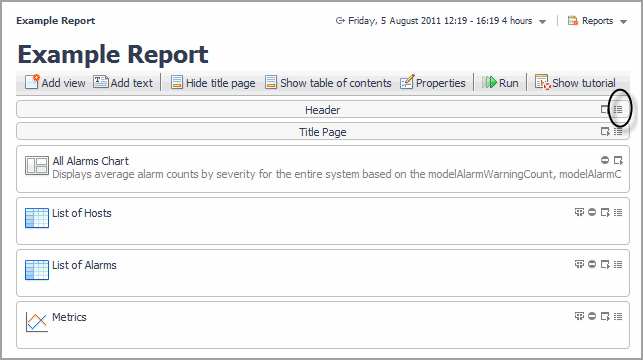 You can also drag and drop views from the Views tab. This tab lists all of the default Quest Foglight views to which you have access. It also lists any non-parameterized custom views that you create and share. By default, views are organized by module (for example, Hosts, or the cartridge in which the view is included); if you select show by role, they are organized based on your roles. Drag and drop views to quickly add information to your report.