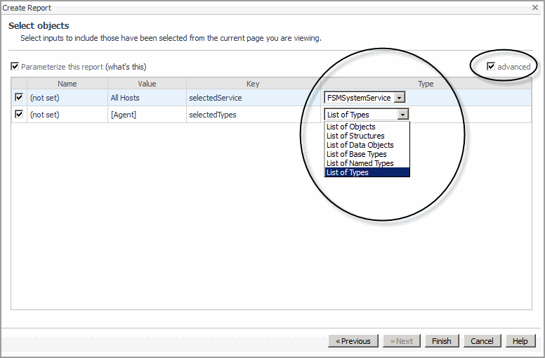 Optional — After you select Parameterize this report, select the Advanced checkbox to choose a data type for any of the services listed. This enables you to reduce the scope of the report to a particular data type. |