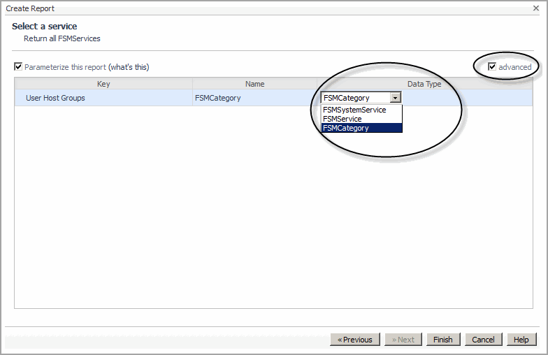 Optional — When Parameterize this report is selected, click the Advanced checkbox to choose a data type for any of the services listed. This enables you to reduce the scope of the report to a particular data type. |