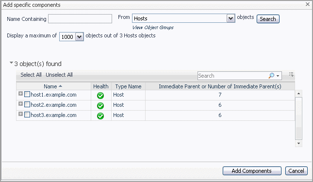 In the Object(s) found table at the bottom of the dialog box, select the specific components you want to add to your Object group. Click Select All to quickly select components listed on the table. Click Unselect All to clear the selection. To locate a component by name and type, click Advanced. You can also use regular expressions.