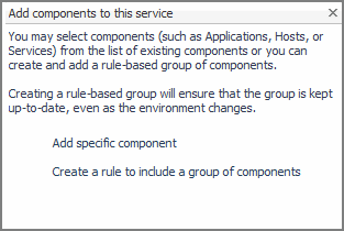 On the dialog box, click Add components to this service and then click Create a rule to add a group of components. Quest Foglight can auotmatically adds the hosts that support any object you add to a service.