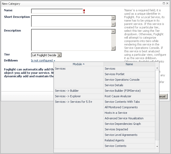 A category is a top-level service. Create a new category to contain a hierarchy of related services if an appropriate category has not already been defined in your Foglight installation. You can create categories for a department, application set, business function, even a team or individual user.