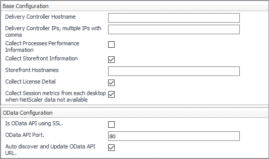The XenDesktop Agent Base Configuration and OData Configuration properties specify general settings the agent needs to connect to the monitored environment.