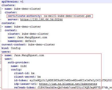 On your local platform, browse to open this configuration file. You may see the context similar to the following. Record <config-cluster-name> for later use. |