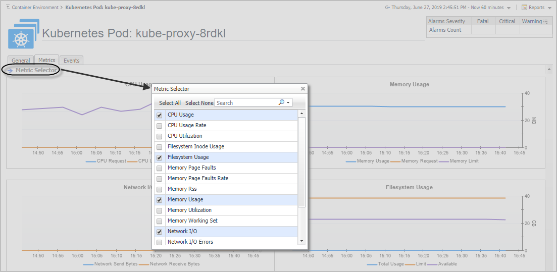 Metrics tab: The Metrics tab displays a Metric Selector allowing you to choose the metrics to be plotted on this dashboard. Charts of CPU Usage, Memory Usage, and Network I/O are presented by default. |