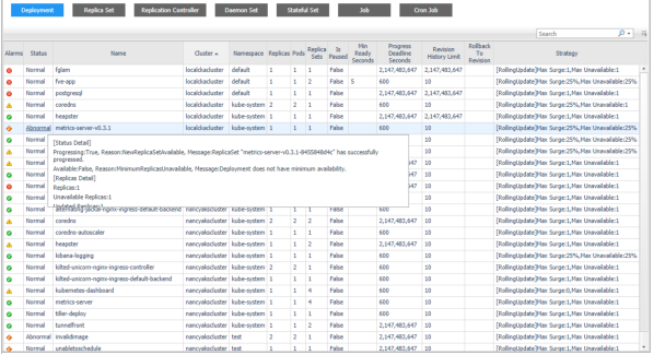 A controller manages a set of pods and ensures that the cluster is in the specified state. Instead of manually creating a pod, controllers can be used to create pods and to manage the pods. For example, the pods maintained by a replication controller are automatically replaced if they fail, get deleted, or are terminated. The Controllers dashboard presents the information related to the following controller types: Deployment, Replica Set, Replication Controller, Daemon Set, Stateful Set, Job, and Cron Job.
